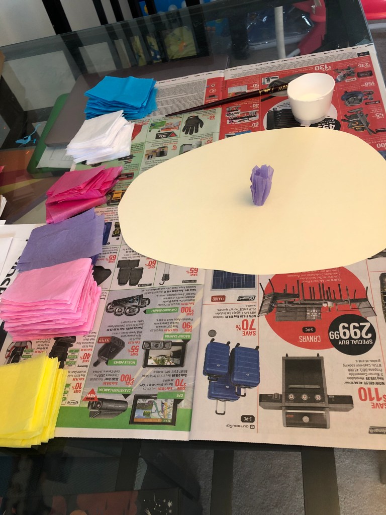 My daughter picked out 6 colours of tissue paper and I cut a sheet into 2″ x 2″ squares. This is the most time-consuming part. Next I got a foam cup (not great on the environment, though) and poured some white craft glue. You can wrap the tissue paper around a pencil or pen but we used a chopstick.