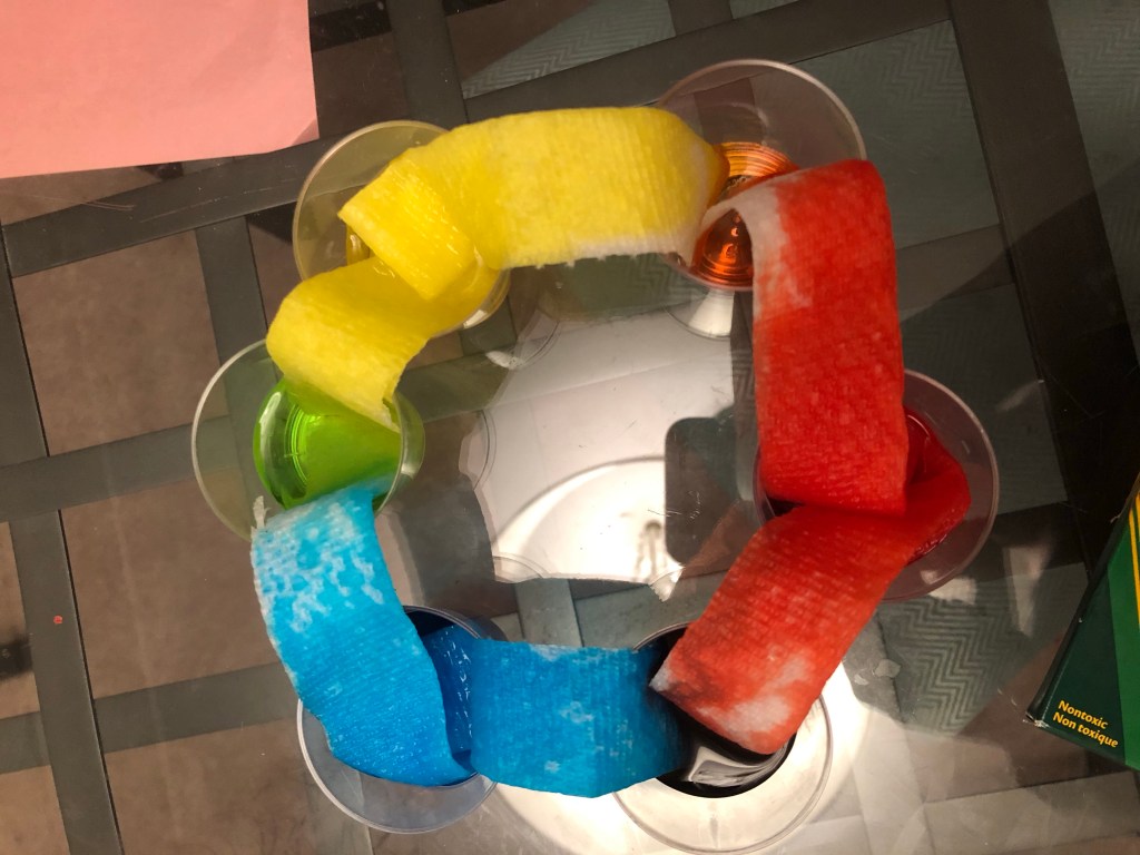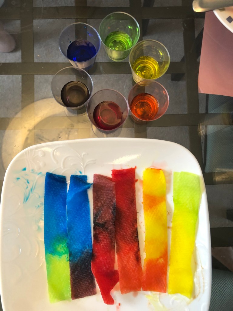 This experiment helped my daughter truly understand why we have primary colours and secondary colours. We set this up at our table and checked back in every once in a while. Some colours worked better than others because the paper towel bits I used weren’t exact.