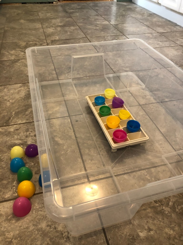 I inserted different colours into the eggs first. The surprise of finding the colour was fun!