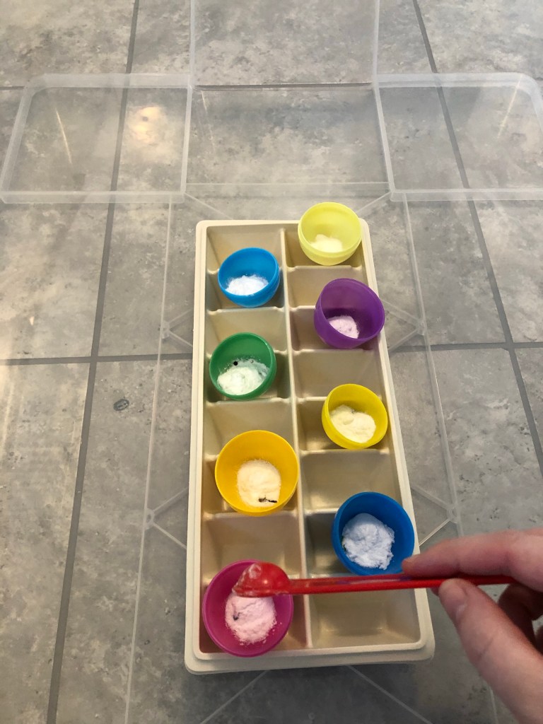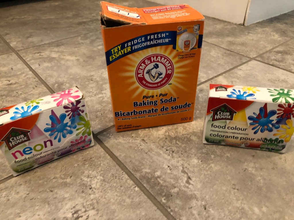Next, I put the baking soda on top of the colours so my daughter couldn’t see.