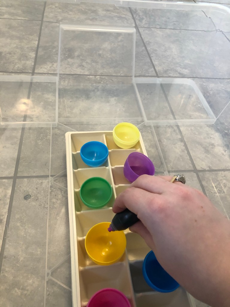 I laid the plastic eggs in the ice cube tray holes to hold them upright.