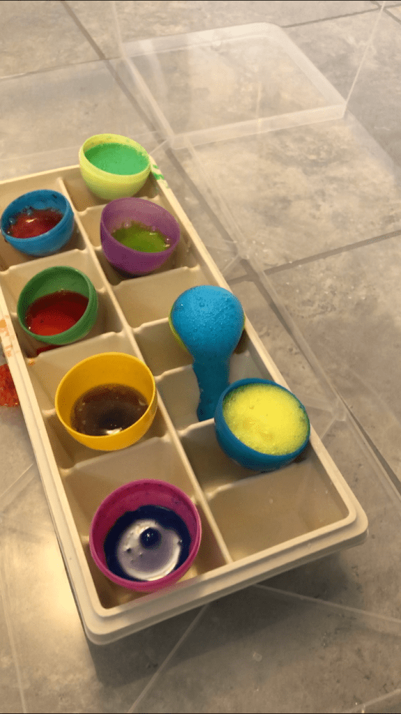 This is an acid/base experiment that ends up getting a little messy! We mix baking soda and vinegar to find the hidden colours underneath. We used plastic eggs to make it an Easter activity.