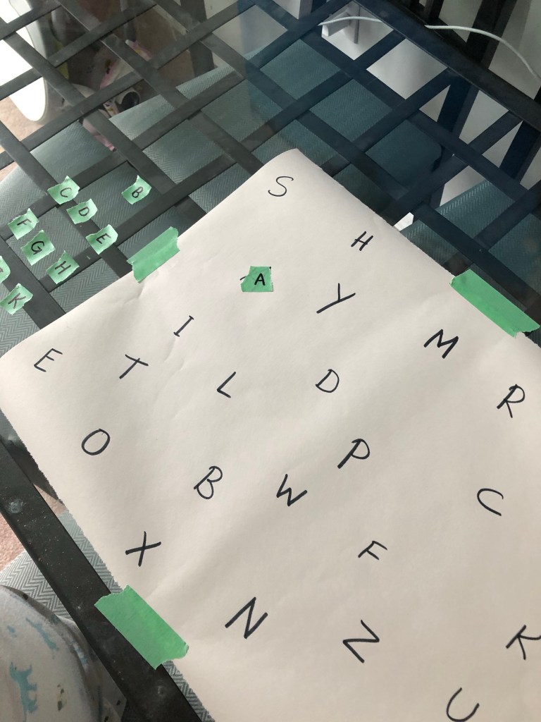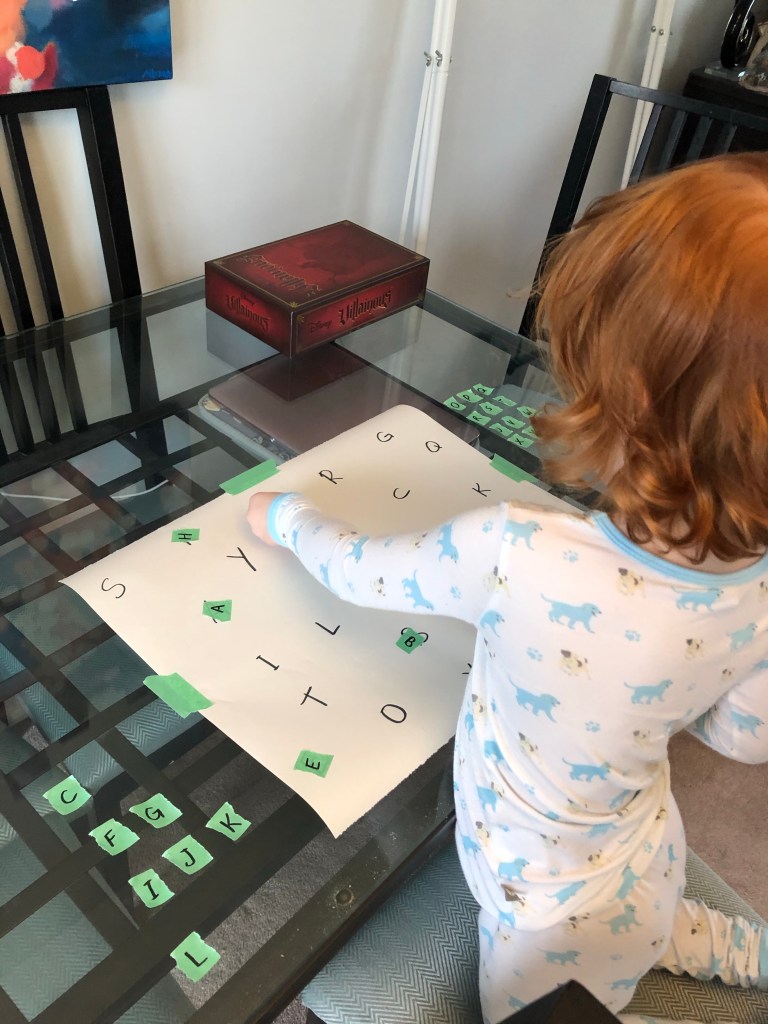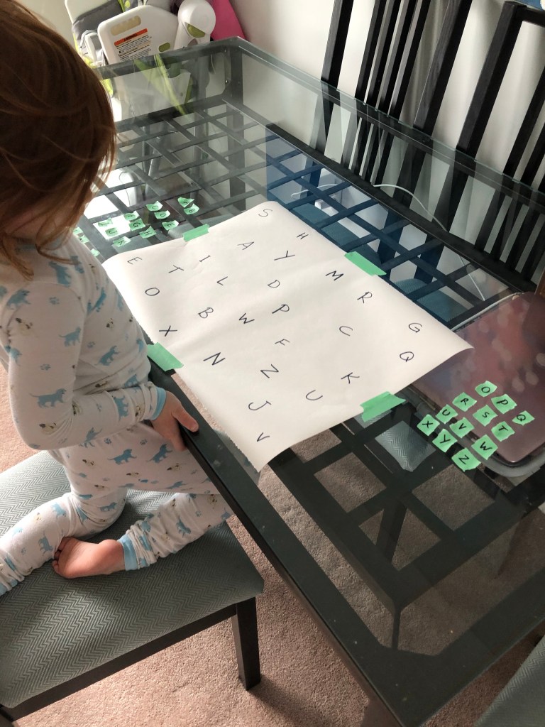 Using Uppercase letters, I randomly wrote the alphabet on a sheet of her craft paper. Then, I ripped pieces of painters tape and wrote the Uppercase alphabet on those. Her job was to match the green stickers to the letter on her paper. It went quicker than I anticipated, so next time I will throw in lowercase and maybe numbers into the mix.