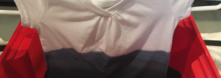 Here is the final result on my daughter. As you can see the blue dye ran into the white in the wash. I assume this is because I was lazy about rinsing out the dye in cold water before washing in the machine. I really like the end result. It was a fun project I was able to mostly finish during a nap. It wasn’t too messy because I had prepared everything beforehand.