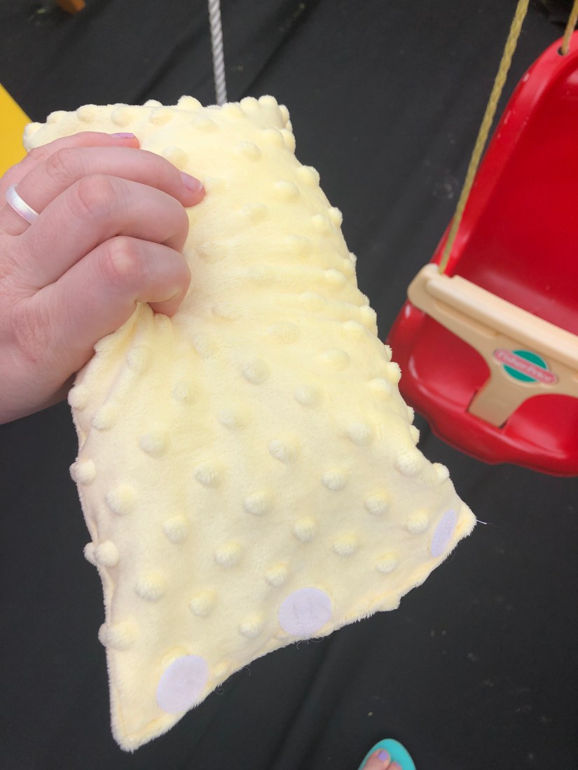 I took a 12″ by 12″ piece of fabric and folded it in half to place the velcro circles. I sewed them onto the fabric first. I then turned the fabric inside out and sewed up a short and long side. I left a short side open to stuff it with pillow stuffing leftover from her knot pillow project. I turned the rough edges in and finished the last short edge. All done!