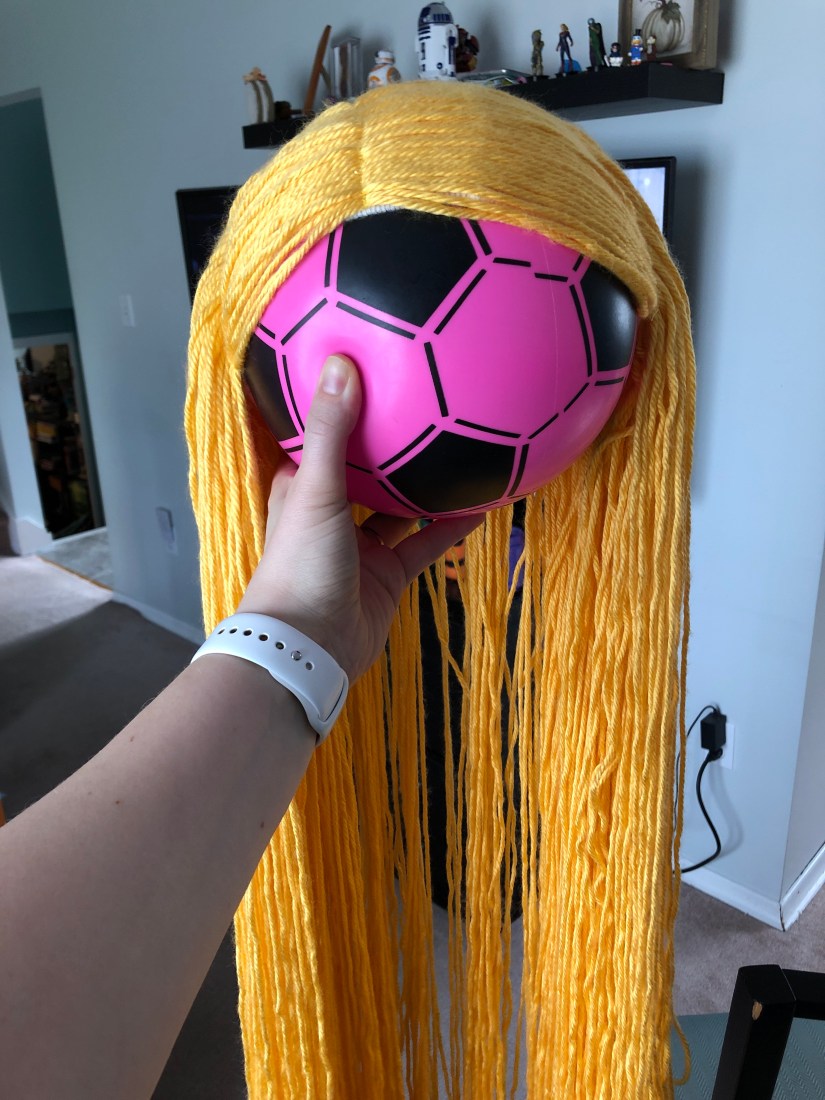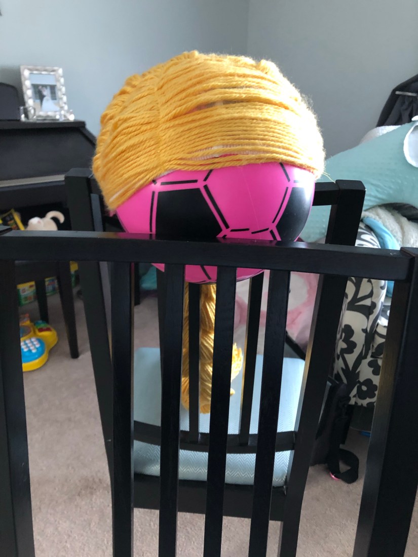 My daughter can’t sit still for any length of time so I used one of her balls as a mannequin for the rest of the process. The yarn kept falling in our faces and you could see massive bald spots so I decided to sew down the front layer of yarn.