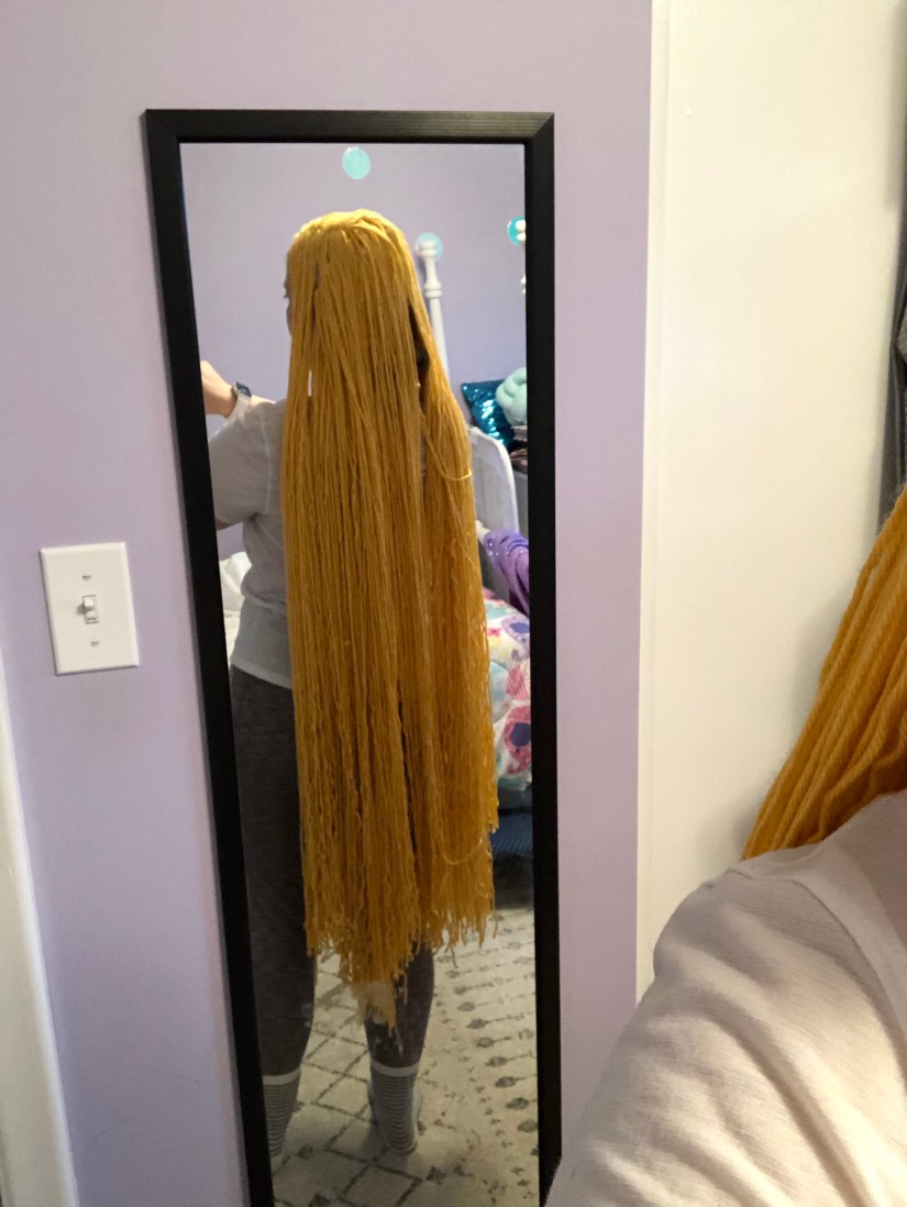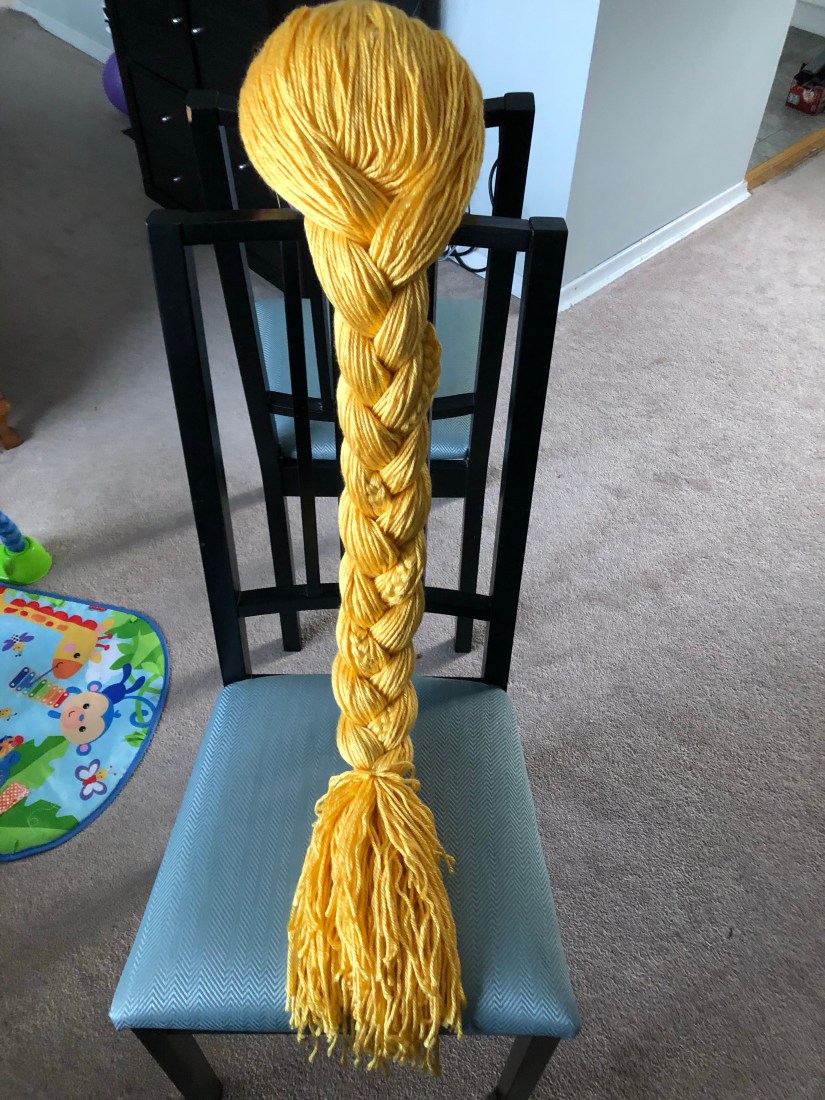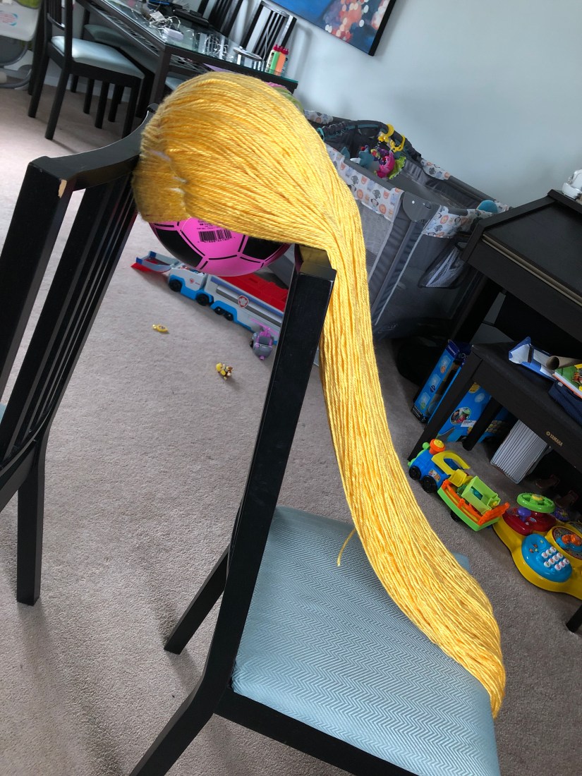 The coveted wig! I am personally not a big fan of halloween but my daughter loves dressing up. She watches Tangled at least once a day so I wasn’t surprised when she wanted to be Rapunzel for halloween. She was lucky enough to get the real Disney dress and shoes but I wanted to try making the wig myself. I started by searching Pinterest and I found this helpful tutorial. I followed it pretty closely. I couldn’t find a suitable hat for the base so I used tights instead. And I machine sewed instead of hand sew. And I found the most beautiful yarn!