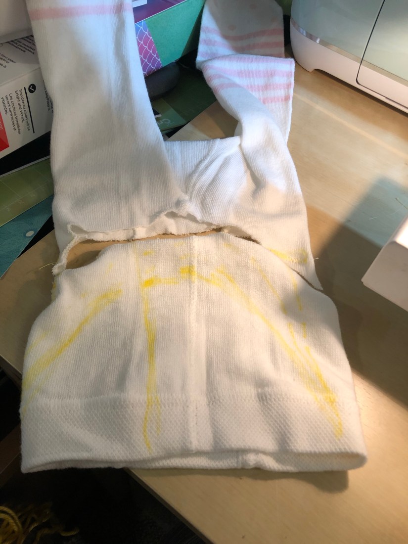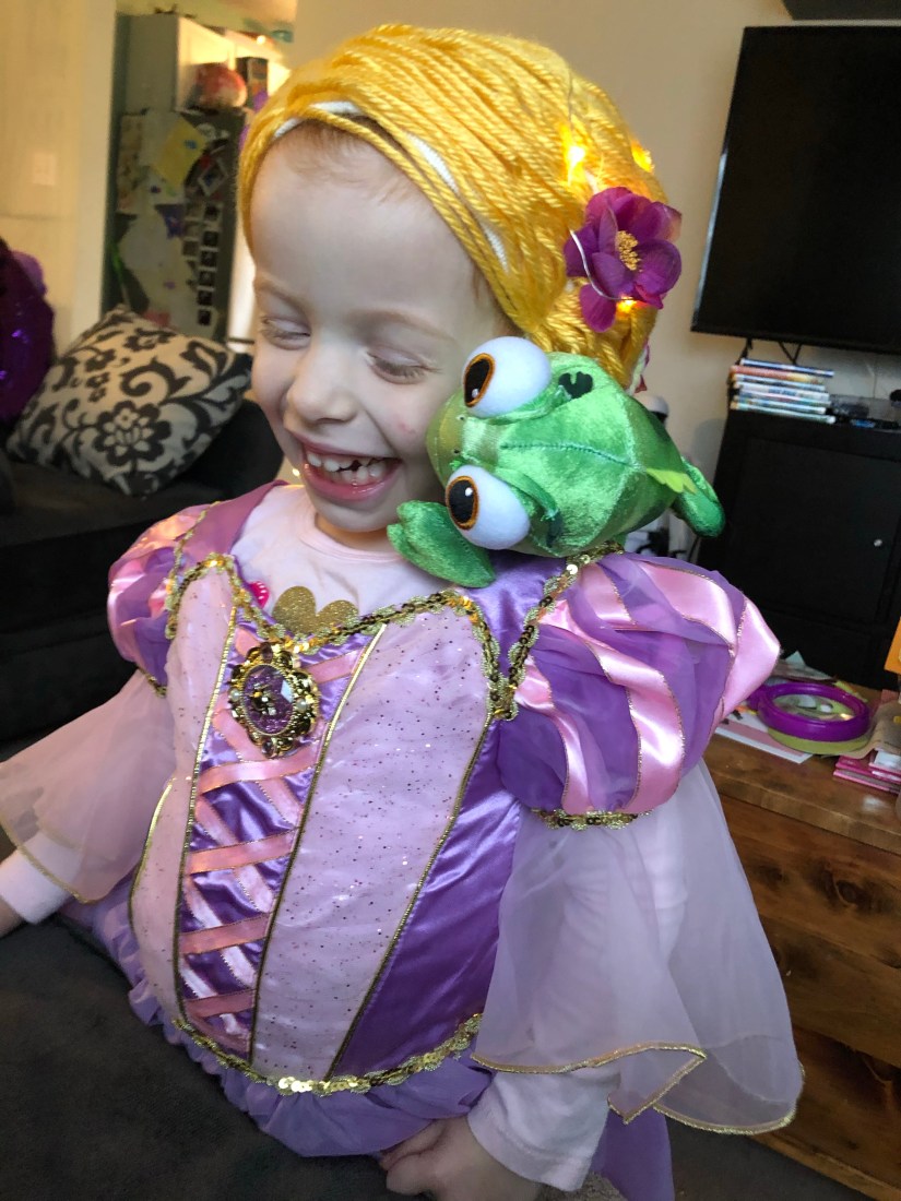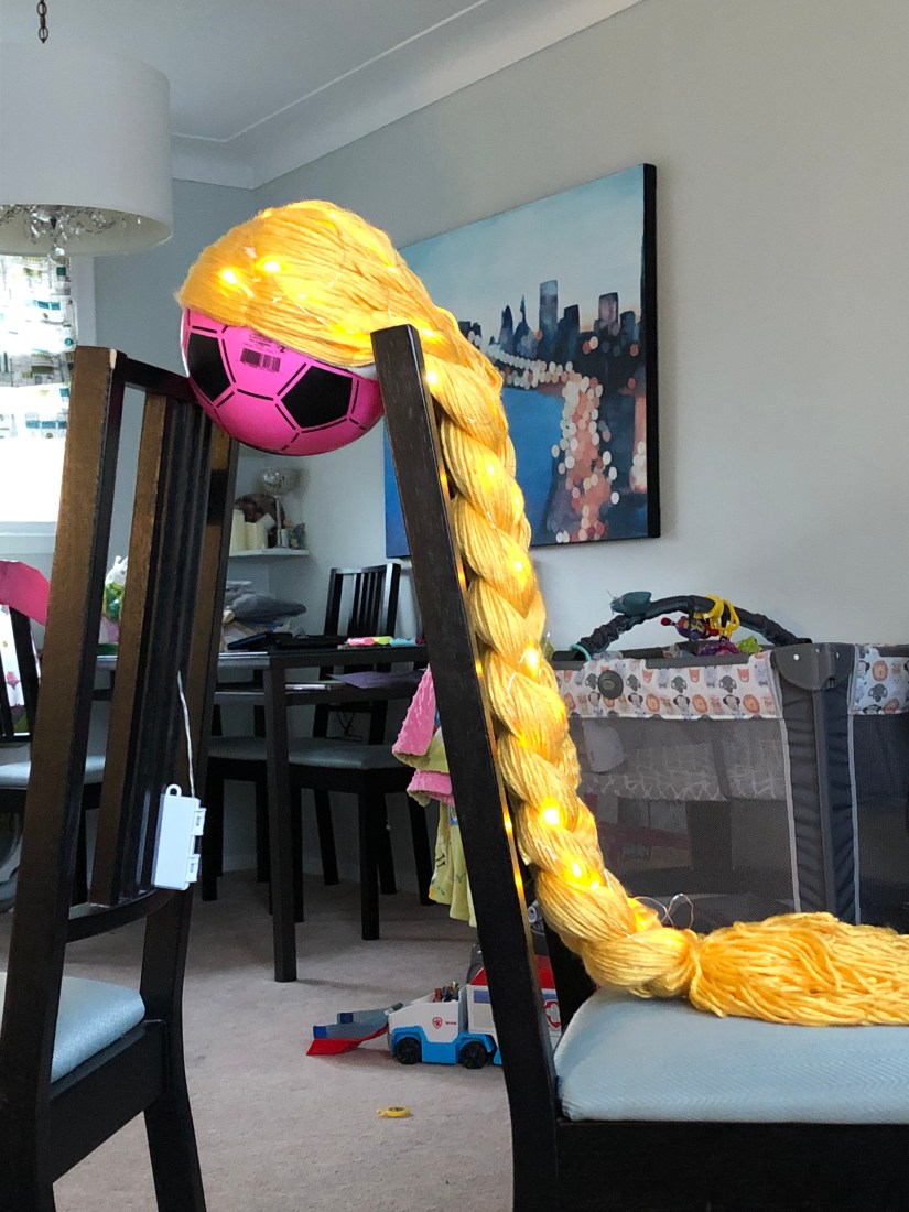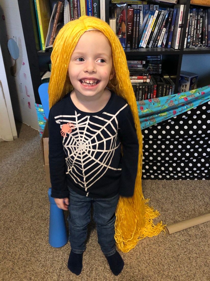 The coveted wig! I am personally not a big fan of halloween but my daughter loves dressing up. She watches Tangled at least once a day so I wasn’t surprised when she wanted to be Rapunzel for halloween. She was lucky enough to get the real Disney dress and shoes but I wanted to try making the wig myself. I started by searching Pinterest and I found this helpful tutorial. I followed it pretty closely. I couldn’t find a suitable hat for the base so I used tights instead. And I machine sewed instead of hand sew. And I found the most beautiful yarn!