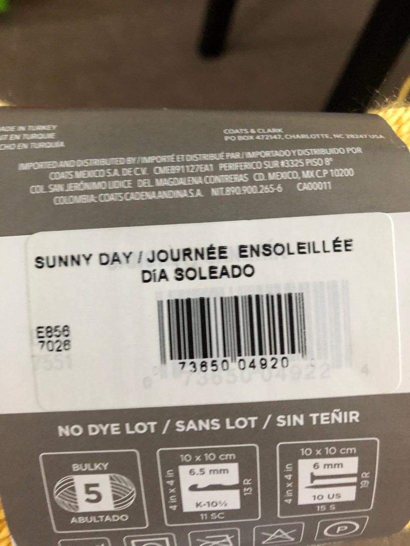 I started by setting up my dining chairs 40″ apart. This was the most back-breaking part. I wound the yarn around until all 3 skeins were done. I cut the yarn at one end and tied a leftover piece of yarn around the middle to keep it together.