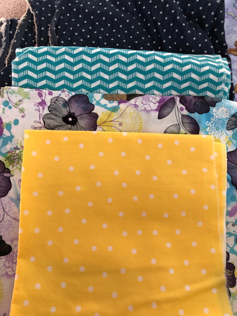 I decided that I had a lot of polka-dotted denim so that would work as my base fabric. I cut two pieces sized 16 3/4″ by 10 1/2″. I then discovered I had enough to make 4 card holders.