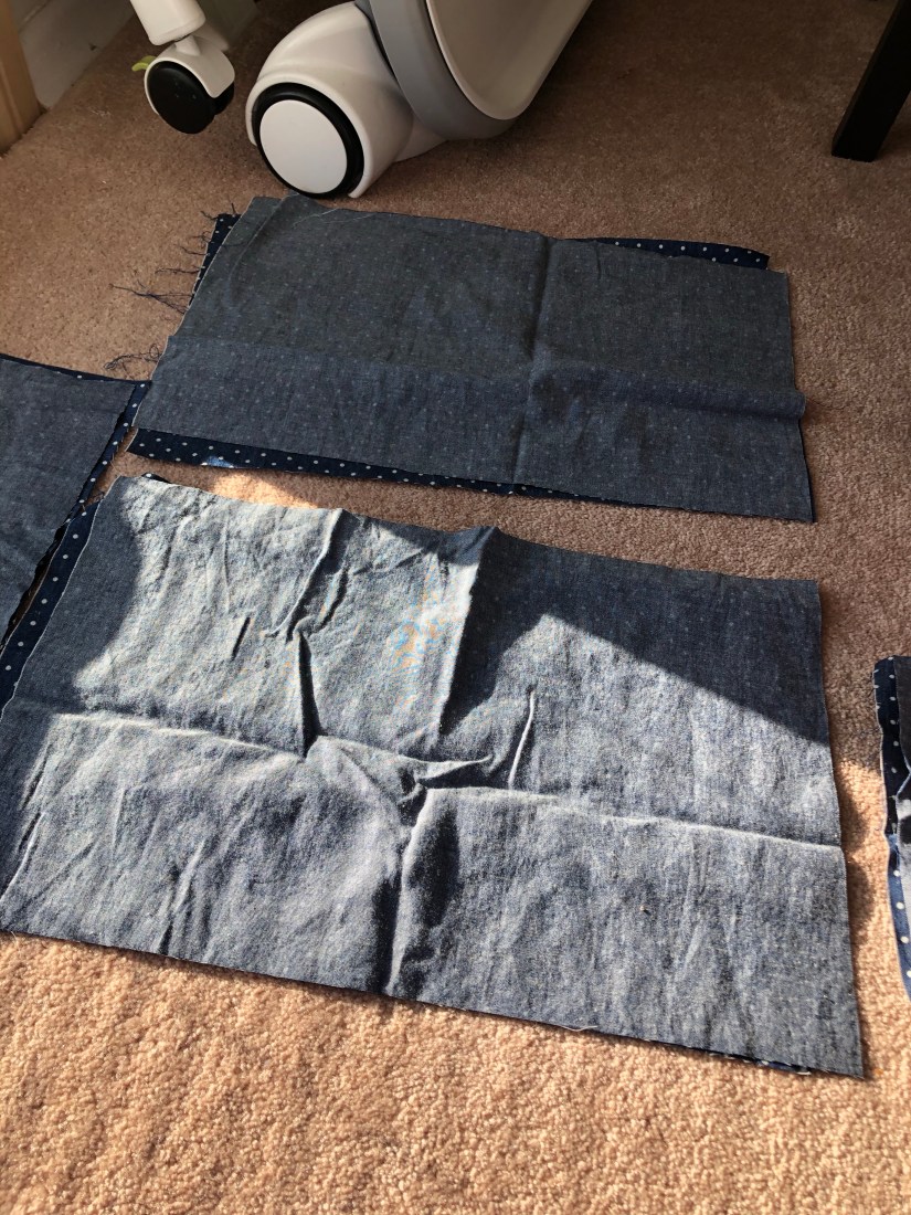 Sew your 3rd pocket. You can see in my picture that I have an extra inch of denim on the bottom which shouldn’t be there. If you’ve measured your fabric properly that chalk line should line up with your bottom pocket.
