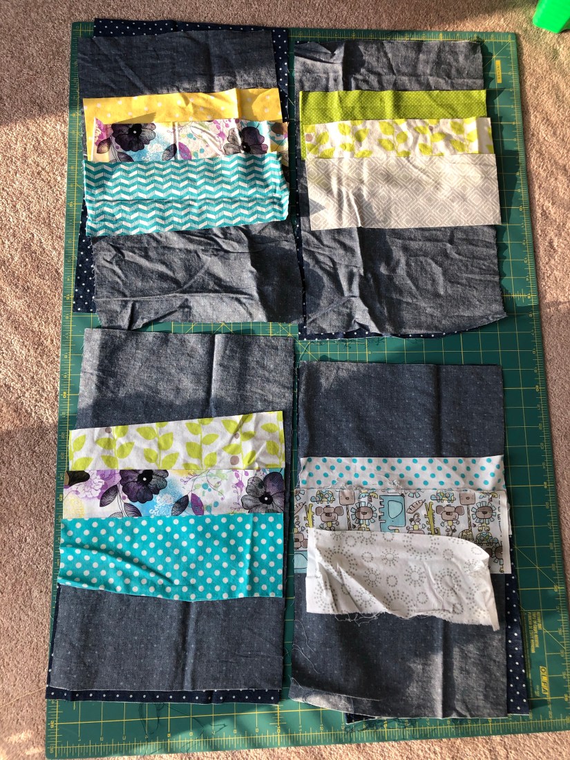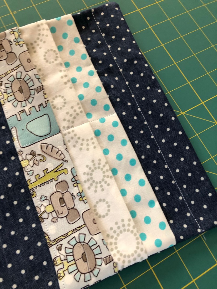 Next, I cut out 3 pocket pieces for each card holder sized 4 3/4″ by 9 3/4″. The fabric was so wrinkly from being in storage that I took some time to iron everything out.