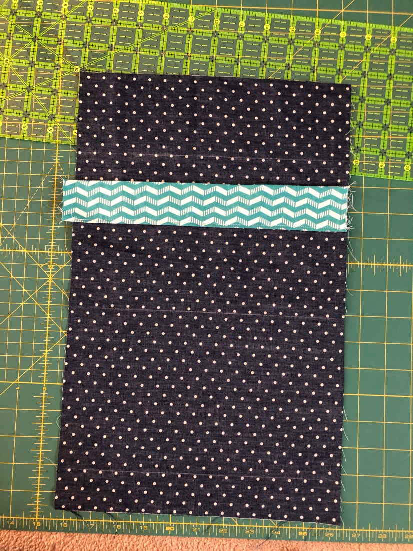 I took the teal chevron piece and sewed a seam along the long sides with right sides together. I turned it right side out and ironed the seam flat then topstitch to make the top of the first pocket.