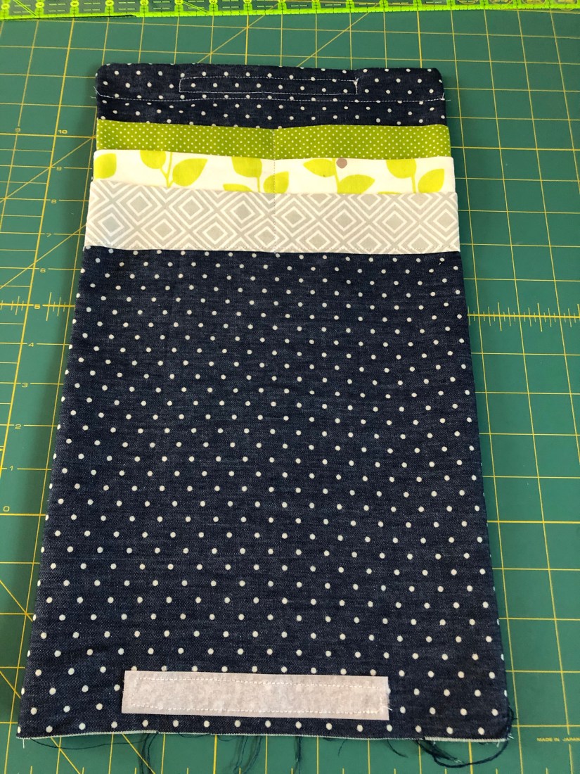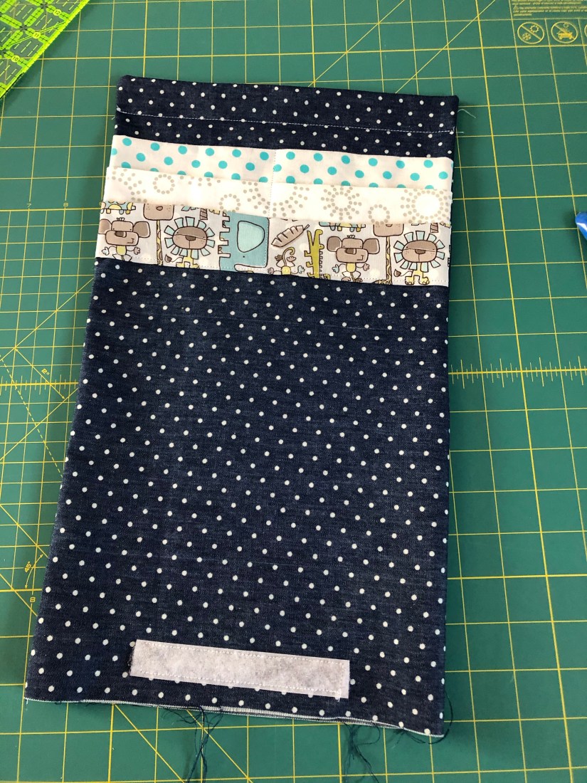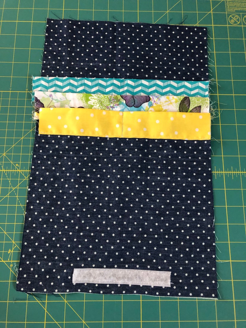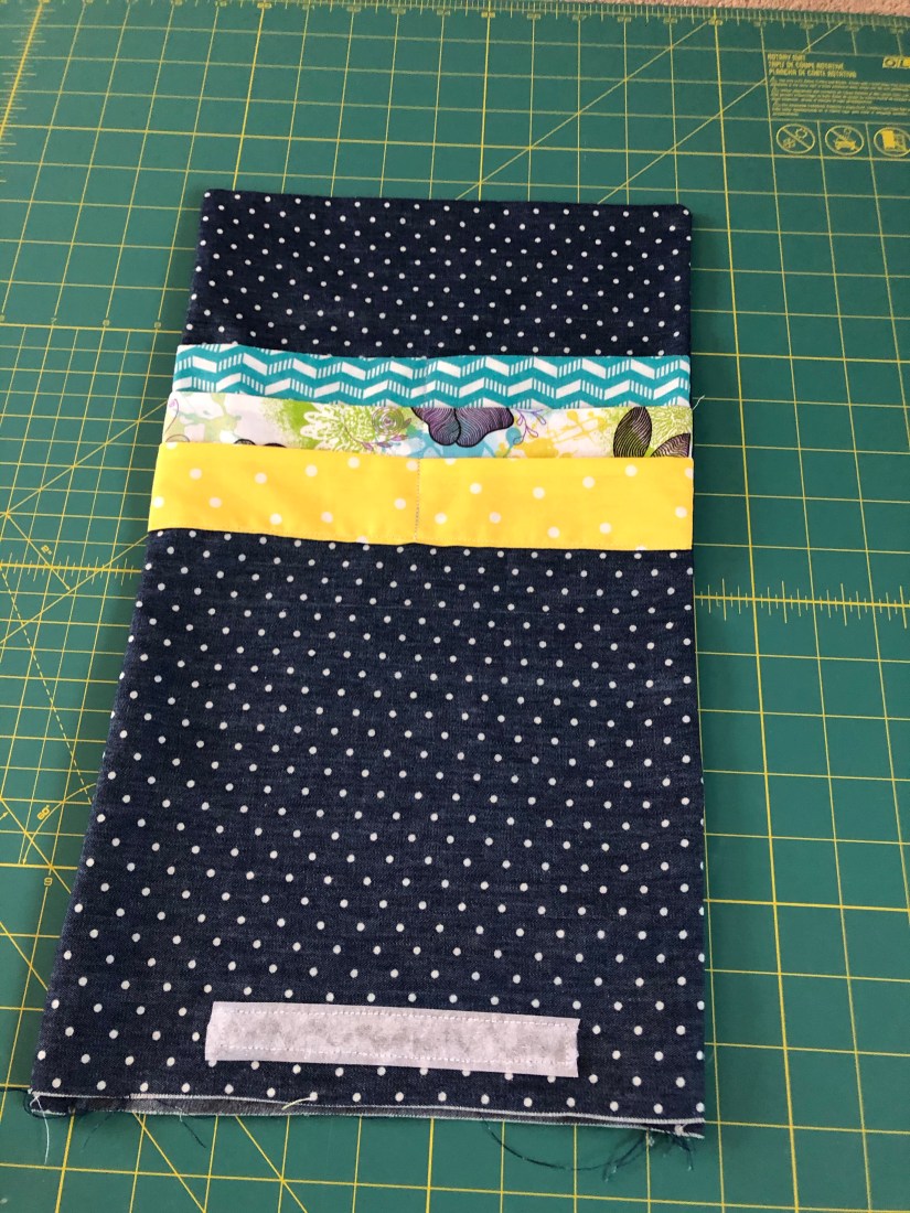 When you look at your large piece of fabric, it should have 3 equal sections 5″ apart with an end panel for the velcro. You can see in my picture below that the top section is much smaller than the next two. That should have been my first clue.