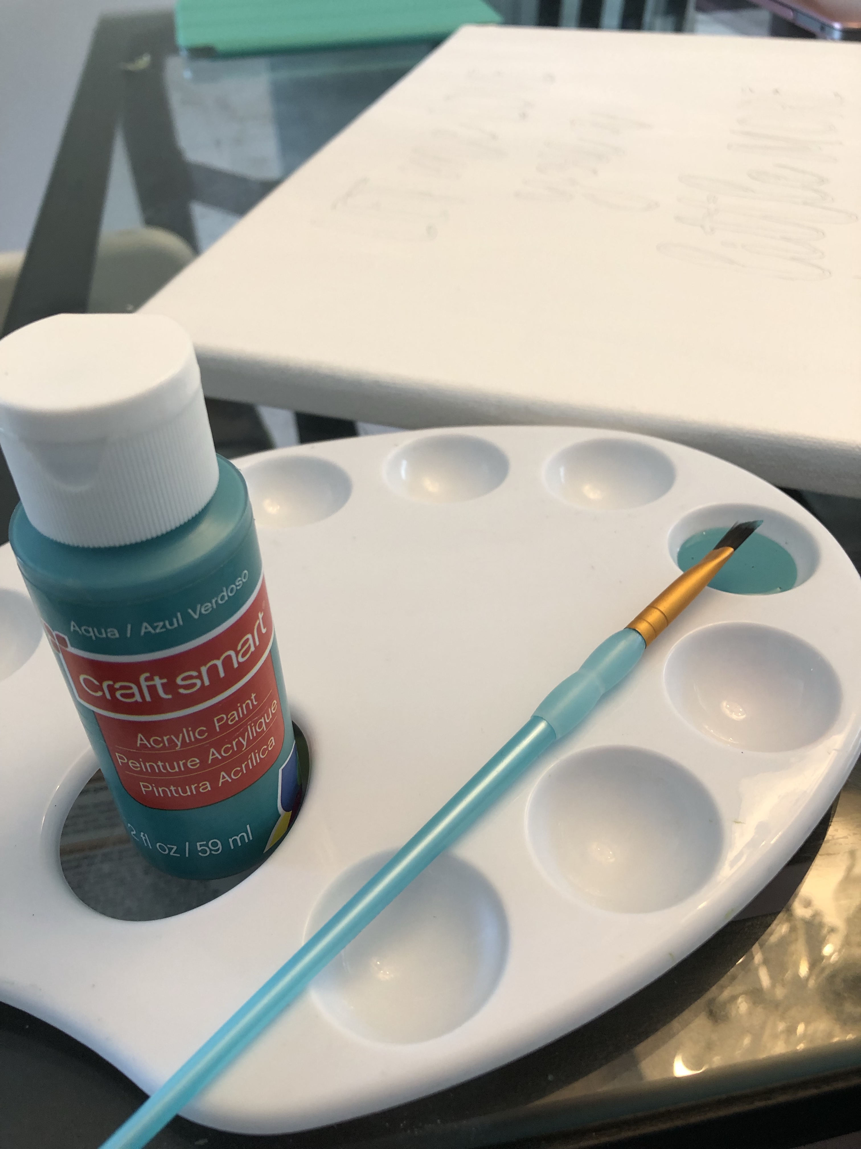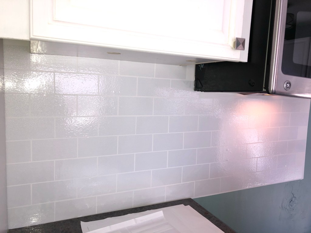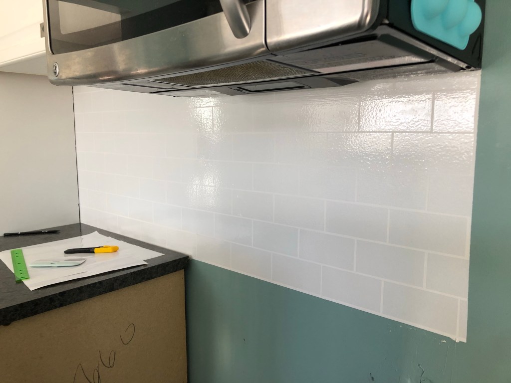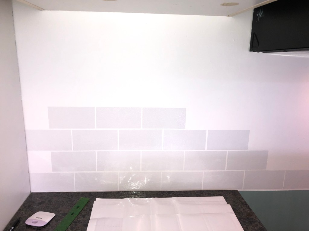 I had the idea saved for a long time and decided that redoing the kitchen again meant I could get this project going, as well. We primed the entire wall where the leak was and I painted a white section on the bottom half where the stickers were going to be. It ended up being the “grout”.