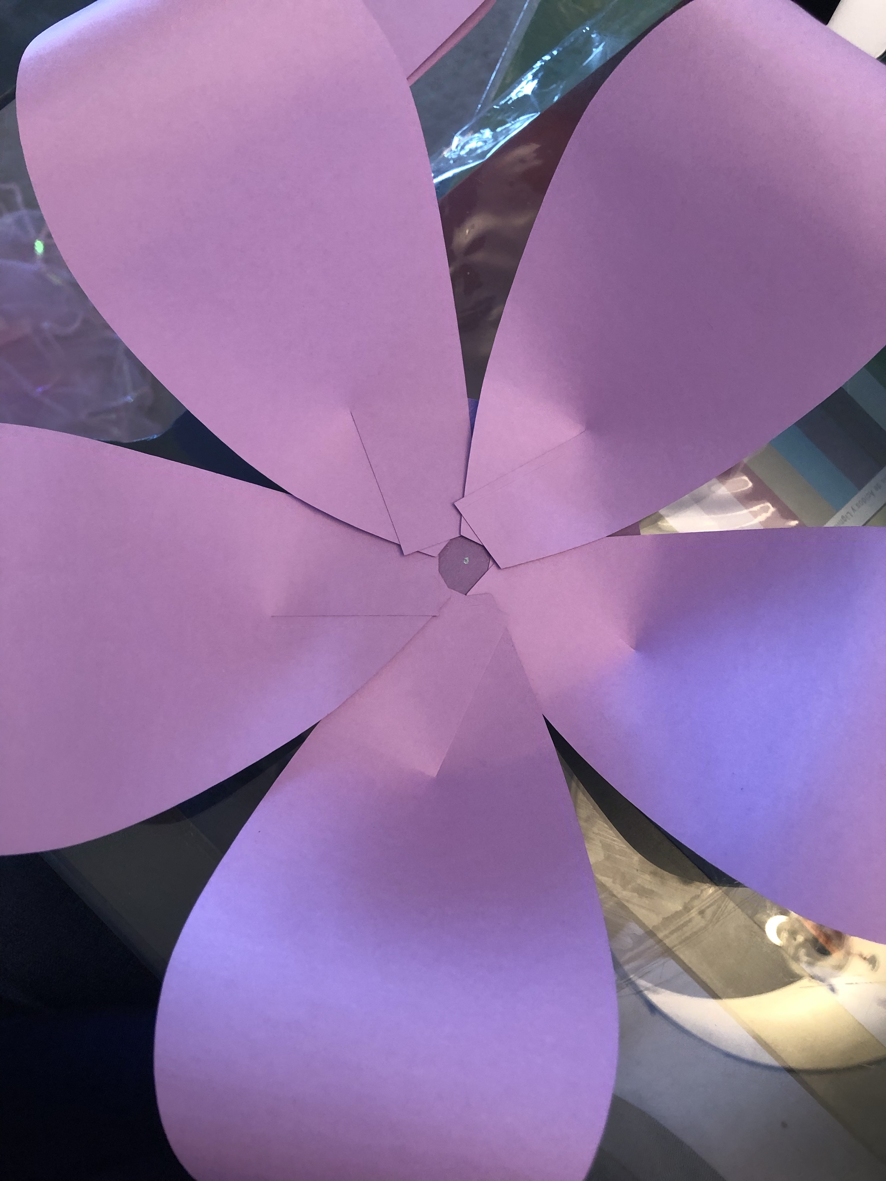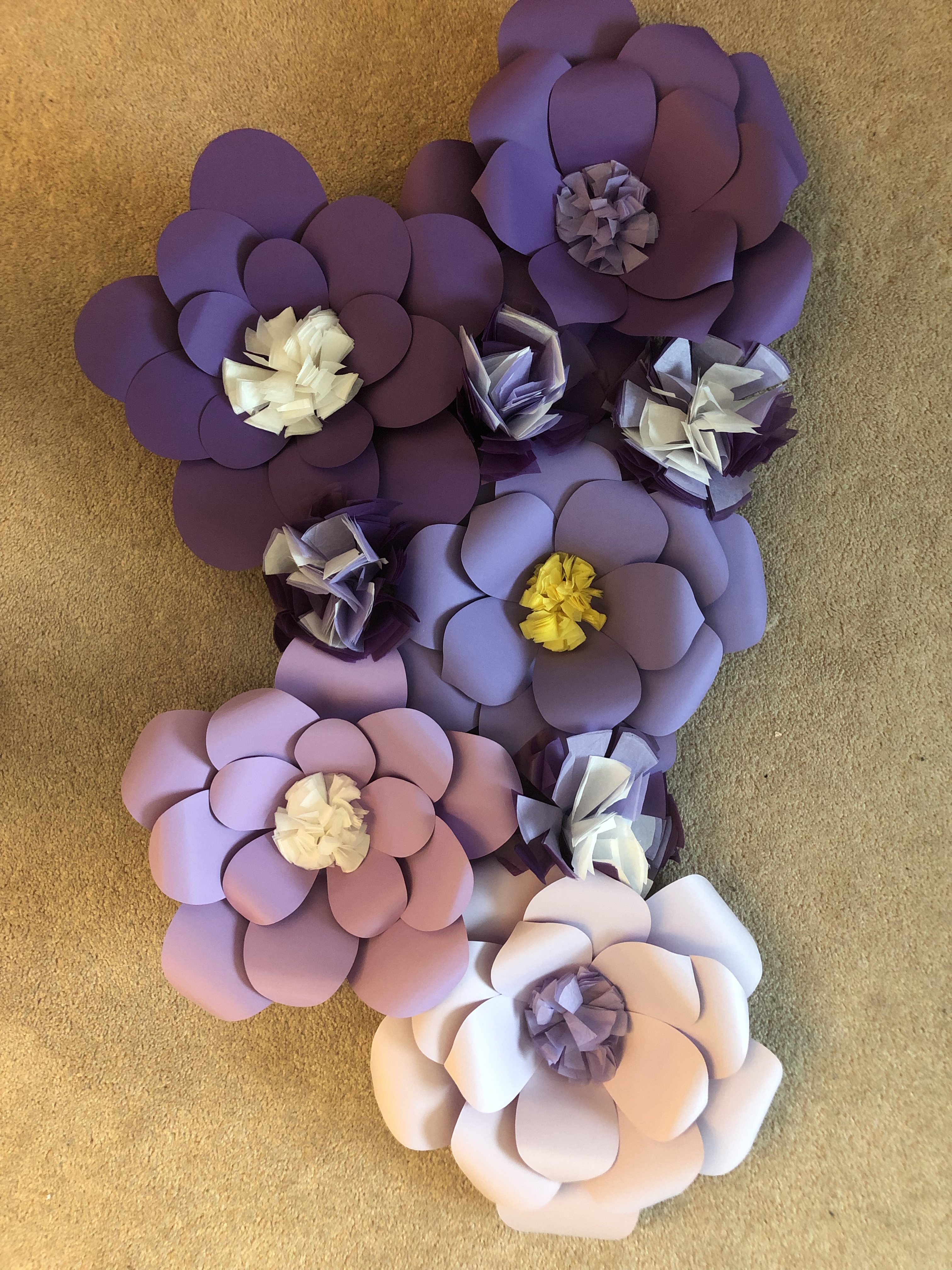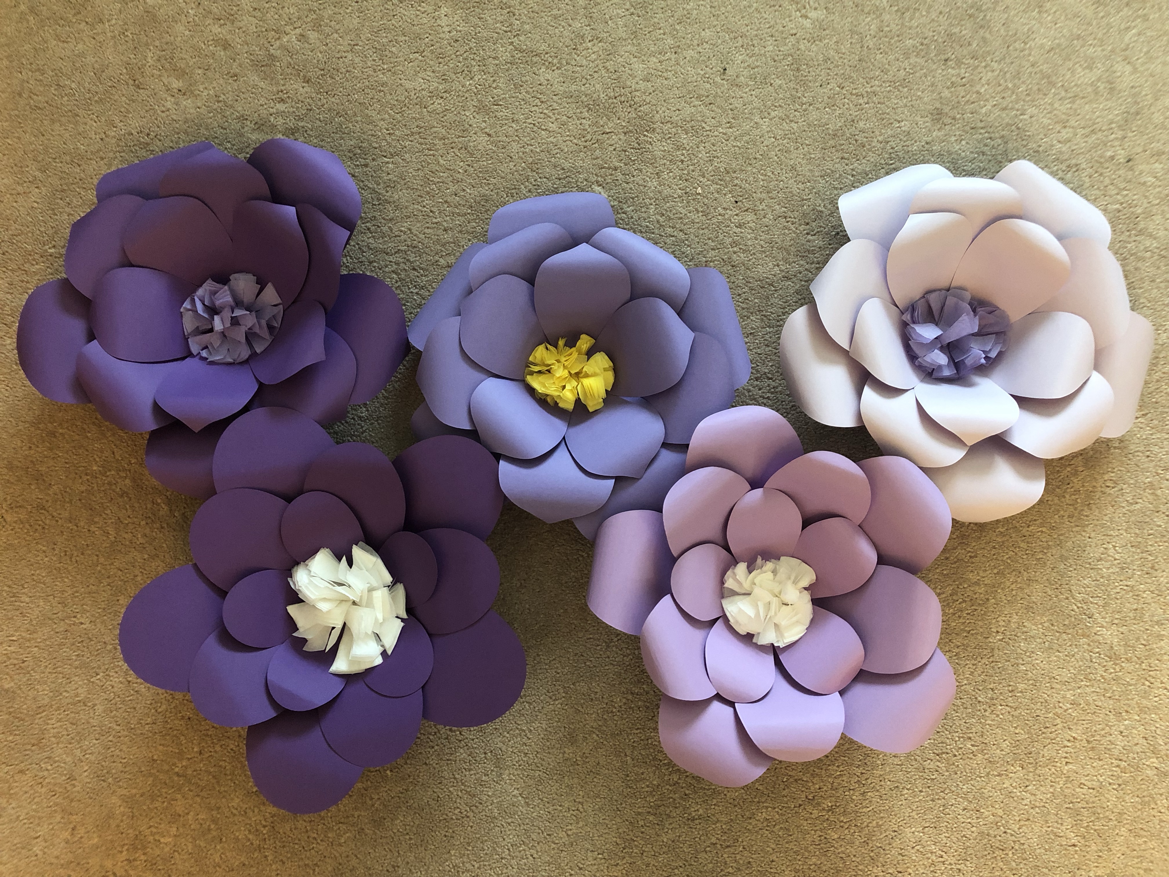 I needed some decorations for grade 8 graduation at my school. I’ve made small paper flowers before but I decided to make a couple larger ones instead. My school’s colours are purple and gold (but we often use yellow, too). I ordered a pack of different shades of purple cardstock from amazon