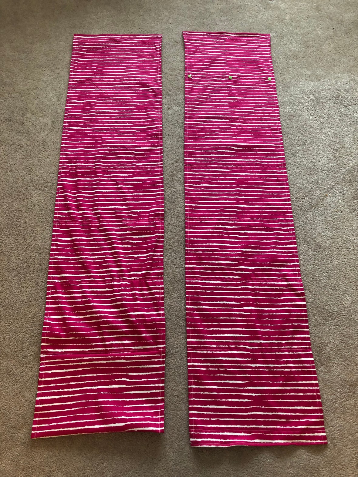 The lines on the fabric aren’t completely straight which makes my lines look sloppier than they really are. They turned out fairly well! I had 6 pockets in one hanger and 7 in the other.