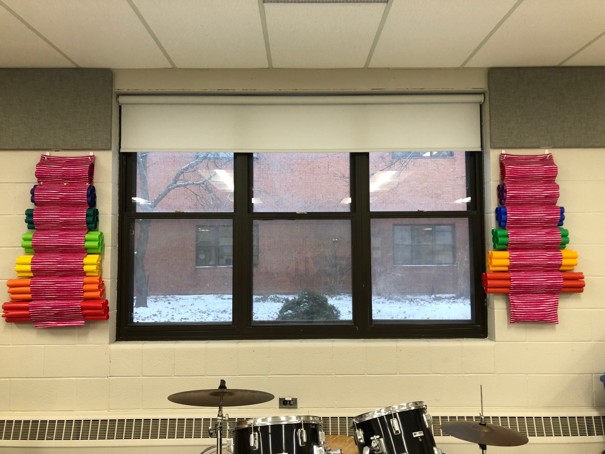 It’s back to school time! My music room was renovated over the summer and I’m slowly getting things back in order. It’s not going to be ready for the first day and I just have to accept that. There are some things in my power to fix up pretty, though. Including the window covering for my classroom door!