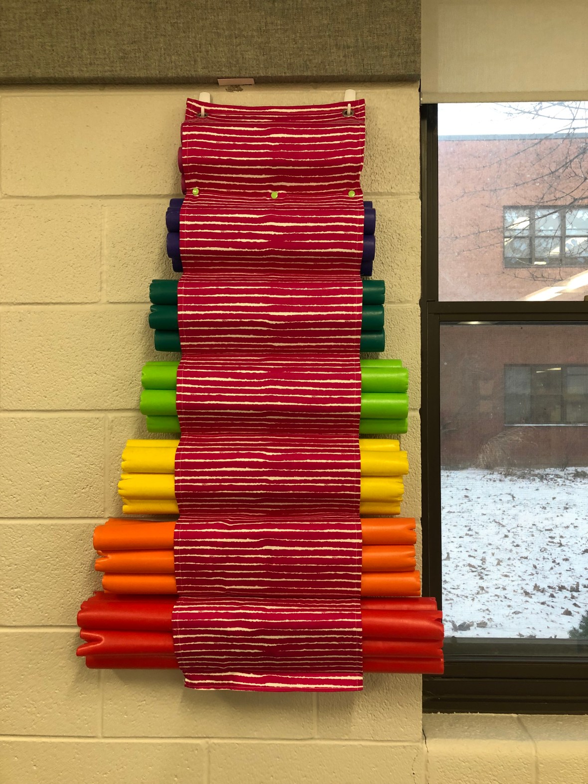 I laid the fabric down on the floor and brainstormed with my husband a bit. I have 13 notes and 5 boomwhackers per note. So in all I have to house 65 boomwhackers. I knew I wanted to have 2 hangers to frame the window on my exterior wall.