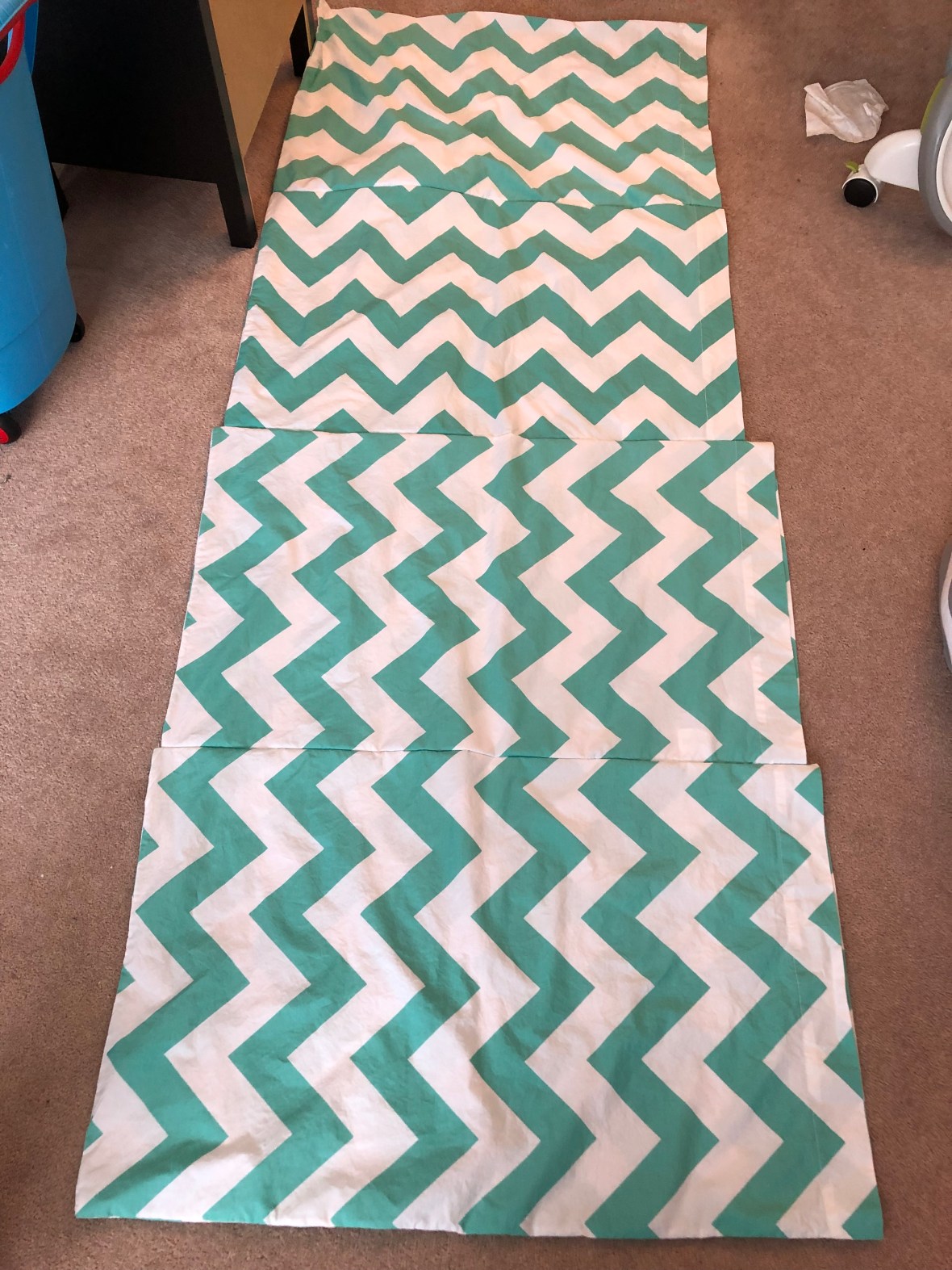 In all, I paid $10 for all 4 pillowcases in a Fabricland sale. I paid $3.50 for each pillow at Walmart. It would be really easy to add pillows on for children or adults that are taller. It took a couple hours to wash, dry and iron the pillowcases and about 10 minutes to sew them together. It was a cheap and easy project!