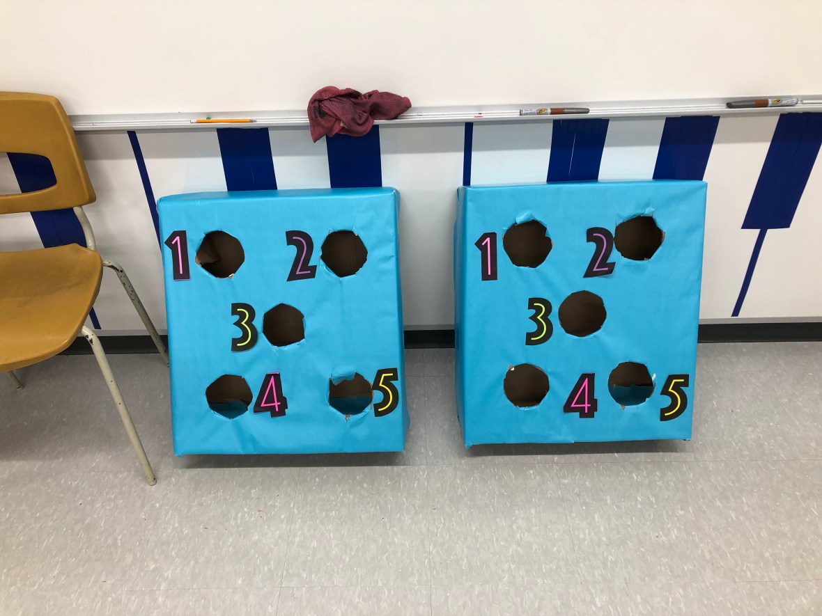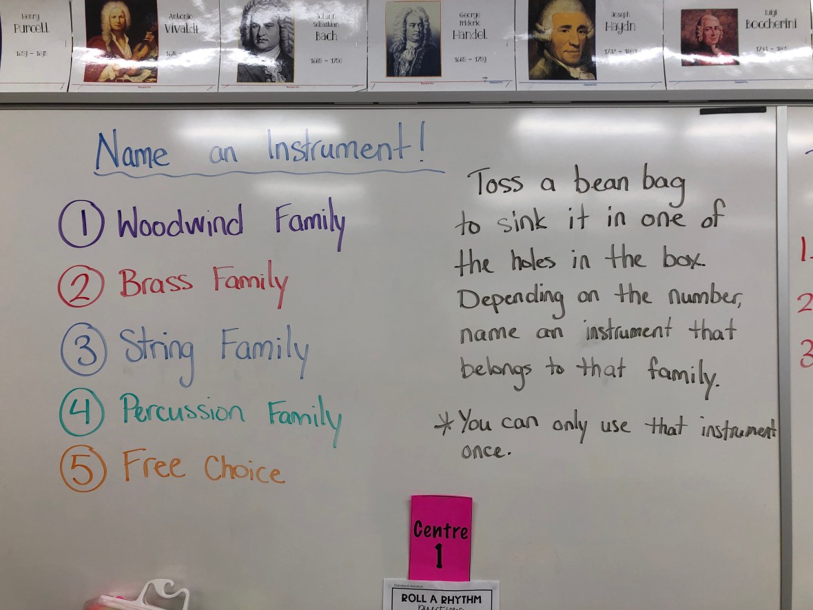 At the time I had students working in centres and one of my centres wasn’t cutting it. I quickly replaced that centre with music corn hole. I numbered each hole so I could change up the game whenever I wanted. For the centre I had a different 4-beat rhythm to clap for each hole. I could write the rhythms up on the board and adjust it according to the grade and difficulty I needed.